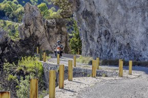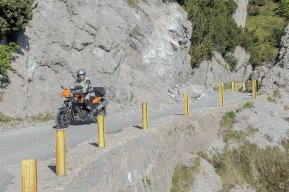 So bin ich nach sehr kurzer Zeit mit Testtempo unterwegs. Dank der hoch liegenden Fußrasten und der stoischen Stabilität fahre ich nach 20 Min „Eingewöhnungsphase“ mit gleichem Tempo und in ähnlich satten Schräglagen über wellige geflickte, mit viel Bitumenstreifen verzierten Pisten wie mit meiner eigenen Honda. Erstaunlich. Und ich habe das Gefühl, da geht noch wesentlich mehr.