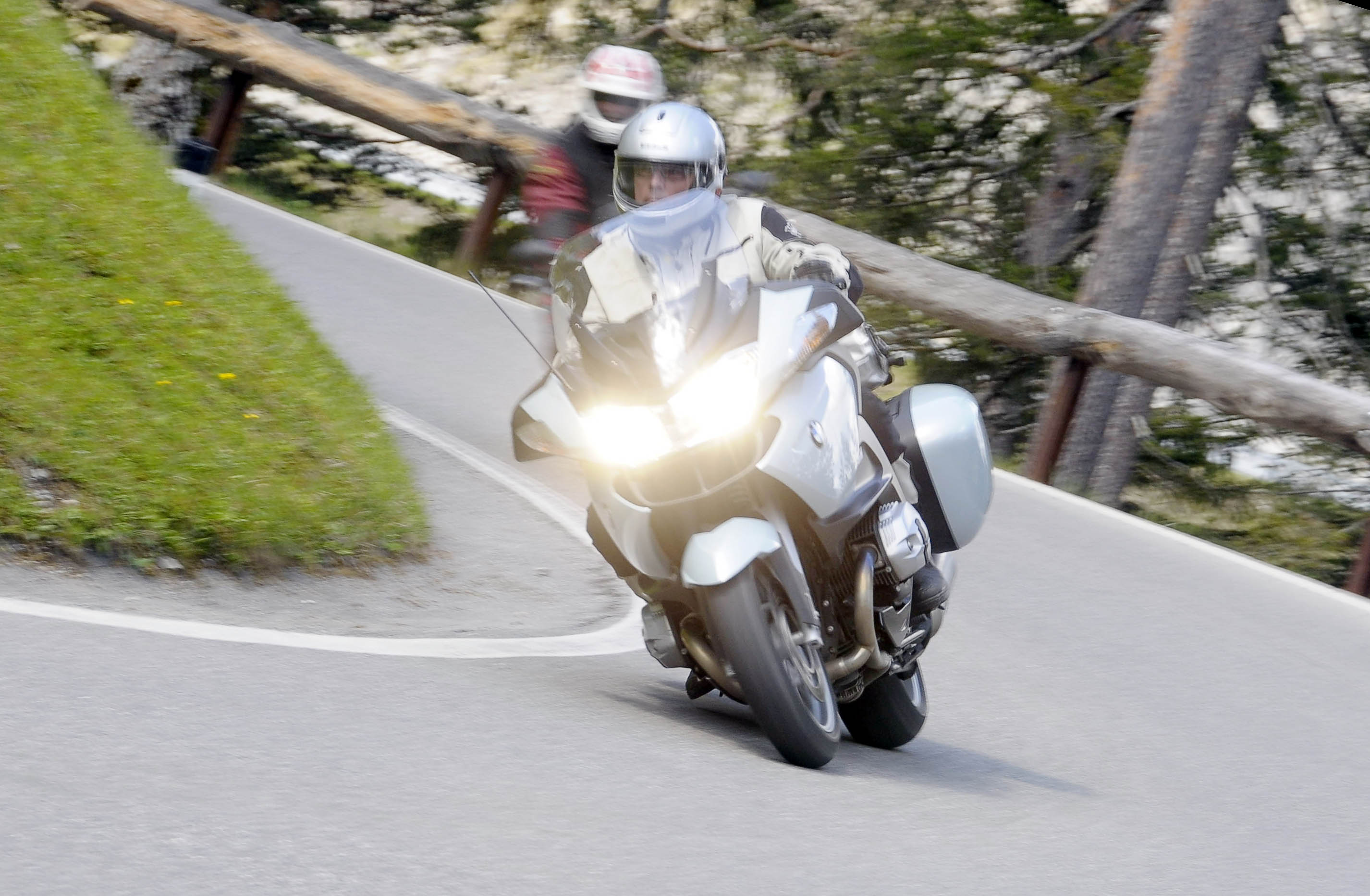 Weil es so schön war, fahr ich das Tal wieder zurück und begebe mich ins Hahntennjoch – bekannt für rutschigen Fahrbahnbelag und auf der Imster Seite für deftige Wellen – auch wieder eine Herausforderung für das Fahrwerk. Auch diese Aufgabe löst die RT hervorragend. Die steilen Kehren zu Beginn verlaufen absolut problemlos. Weiter oben donnert eine 1200er GS an mir vorbei, als ich einen Ausblick genieße. Ich frage mich, ob die schwere RT der GS auf ihrem Hometerrain das Wasser reichen kann und gebe Gas. Mit viel Schwung, deftigen Schräglagen und satten Beschleunigungen hole ich zur GS auf. Der Fahrer legt nochmals Kohlen auf und treibt seinen Boxer derb an. DOHC-beflügelt ziehe ich nach und kann dran bleiben, könnte sogar noch an ihm vorbei, wenn es die Strecke zuließe. Aber zu kurz sind die übersichtlichen Strecken, sodass ich hinter ihm bleibe.